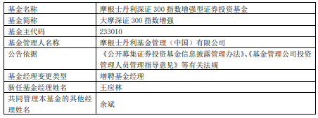 中国经济网北京11月10日讯近日开云kaiyun.com,摩根士丹利基金公告,大摩深证300指数增强增聘王应林。