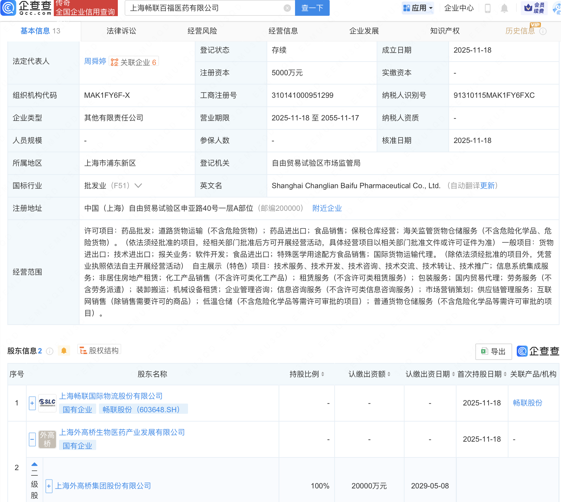 近日,上海畅联百福医药有限公司建设,注册成本5000万元,看法鸿沟包含:药品收支口;食物销售;保税仓库看法;海关监管货品仓储就业(不含危急化学品、危急货品)等。企查查股权穿透透露,该公司由畅联股份(603648)、外高桥(600648)全资子公司上外洋高桥生物医药产业发展有限公司共同抓股。