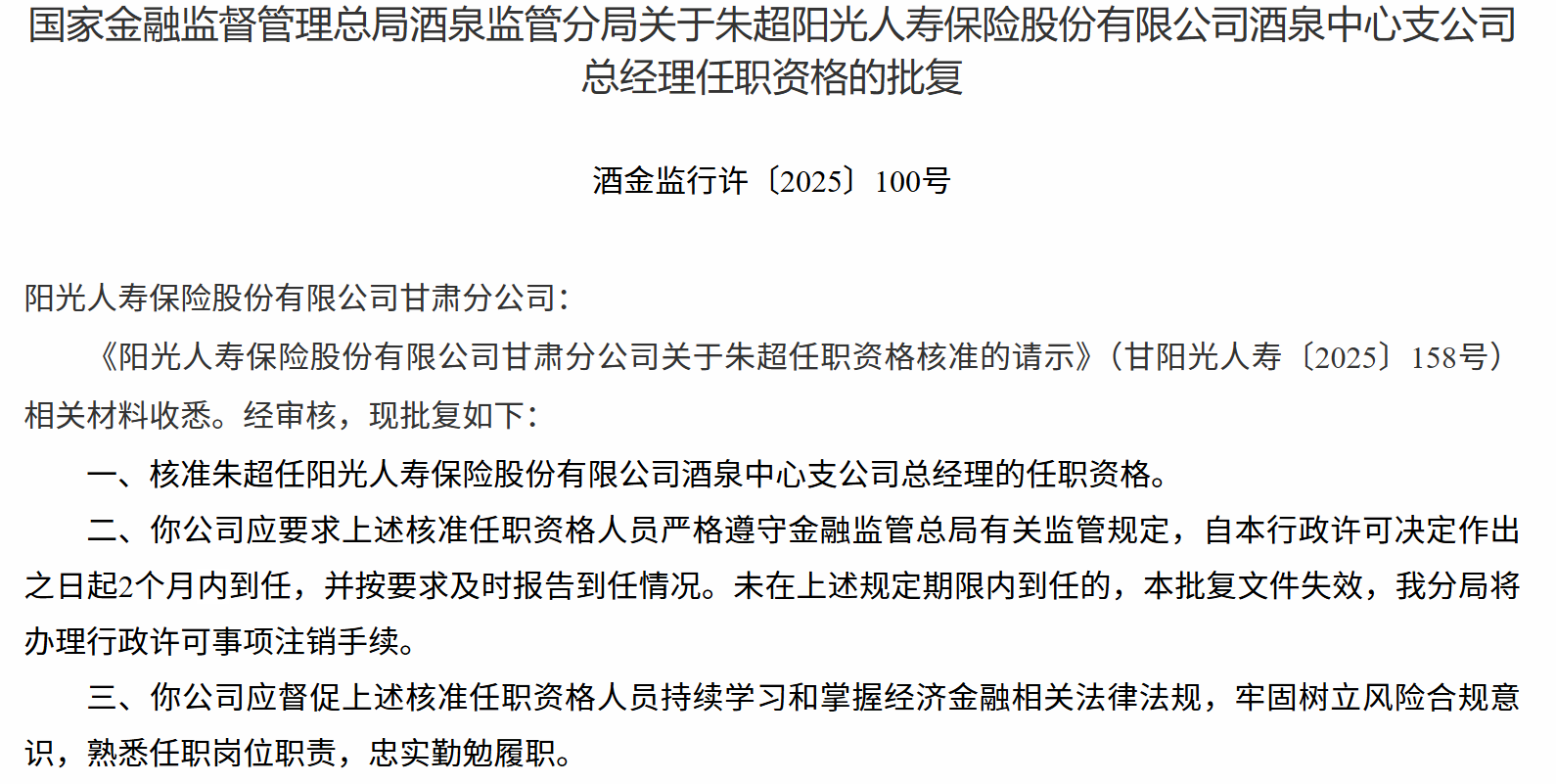 11月19日,国度金融监督处罚总局酒泉监管分局发布对于朱超阳光东谈主寿保障股份有限公司酒泉中心支公司总司理任职阅历的批复,核准朱超任阳光东谈主寿保障股份有限公司酒泉中心支公司总司理的任职阅历。